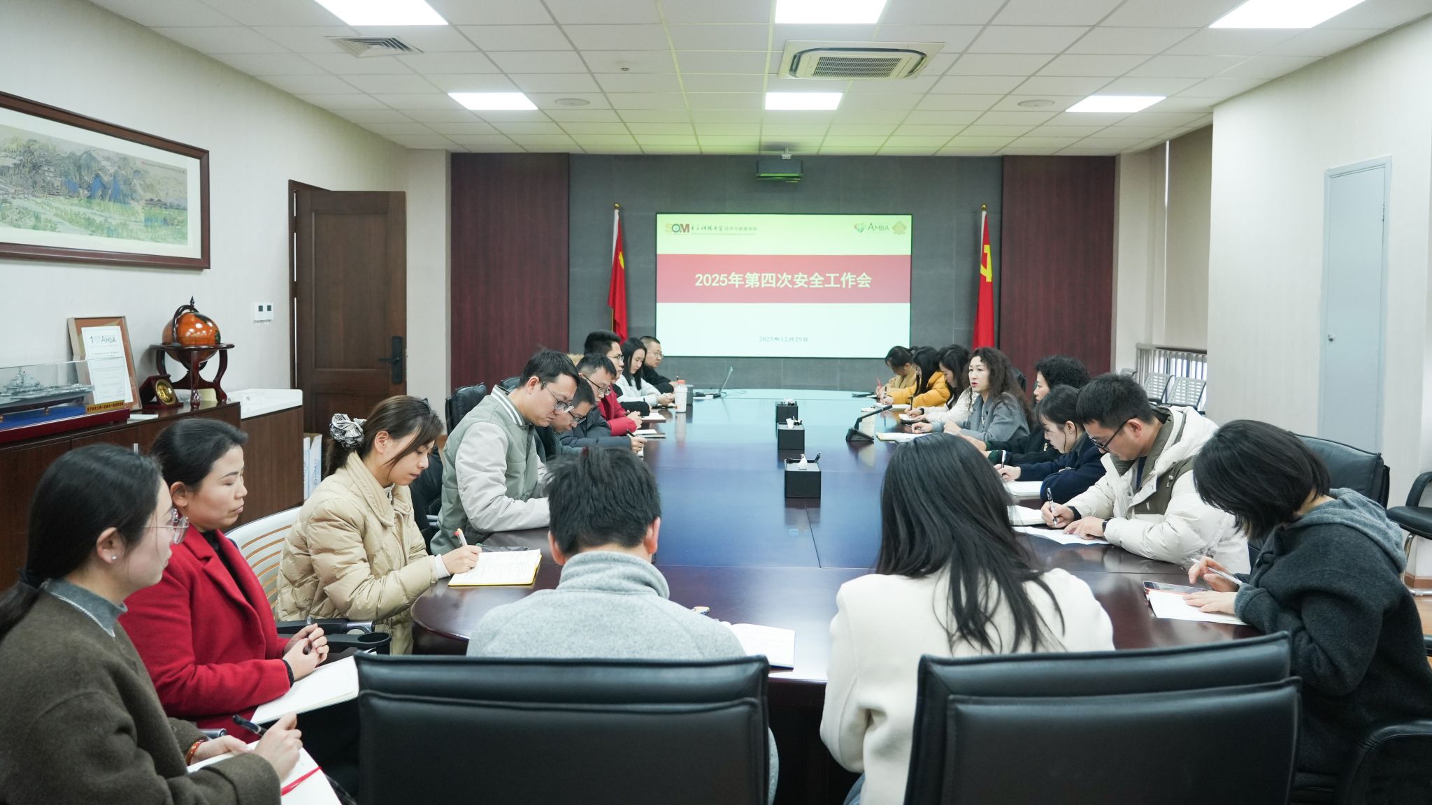 12月29日,经管学院在C301会议室召开2025年第四次安全工作会,安排部署近期重点工作。学院党委书记李钰、副院长刘莉、党委副书记潘杨、各科室和各项目负责人及相关工作人员参会。办公室主任刘军主持会议。会议首先传达了学校第四次安全工作会议精神。李钰结合学院实际,重点强调了政治安全、意识形态安全、保密安全、网络与信息安全、人才安全、生产安全、学生心理安全、实验室安全、考试安全及涉外安全等十个方面的工作要求。...