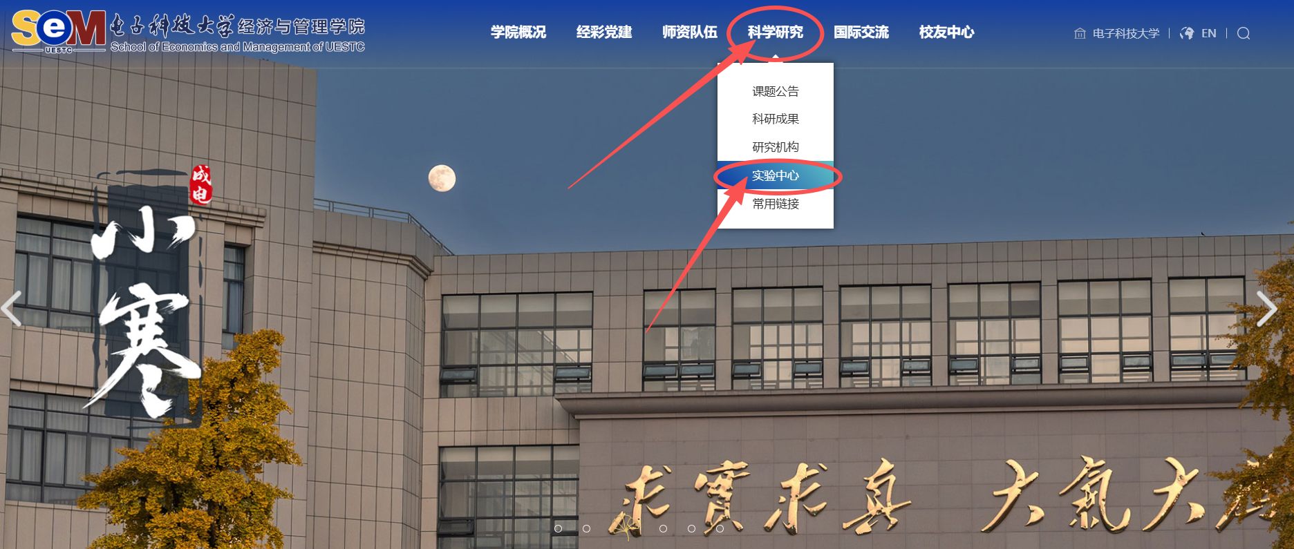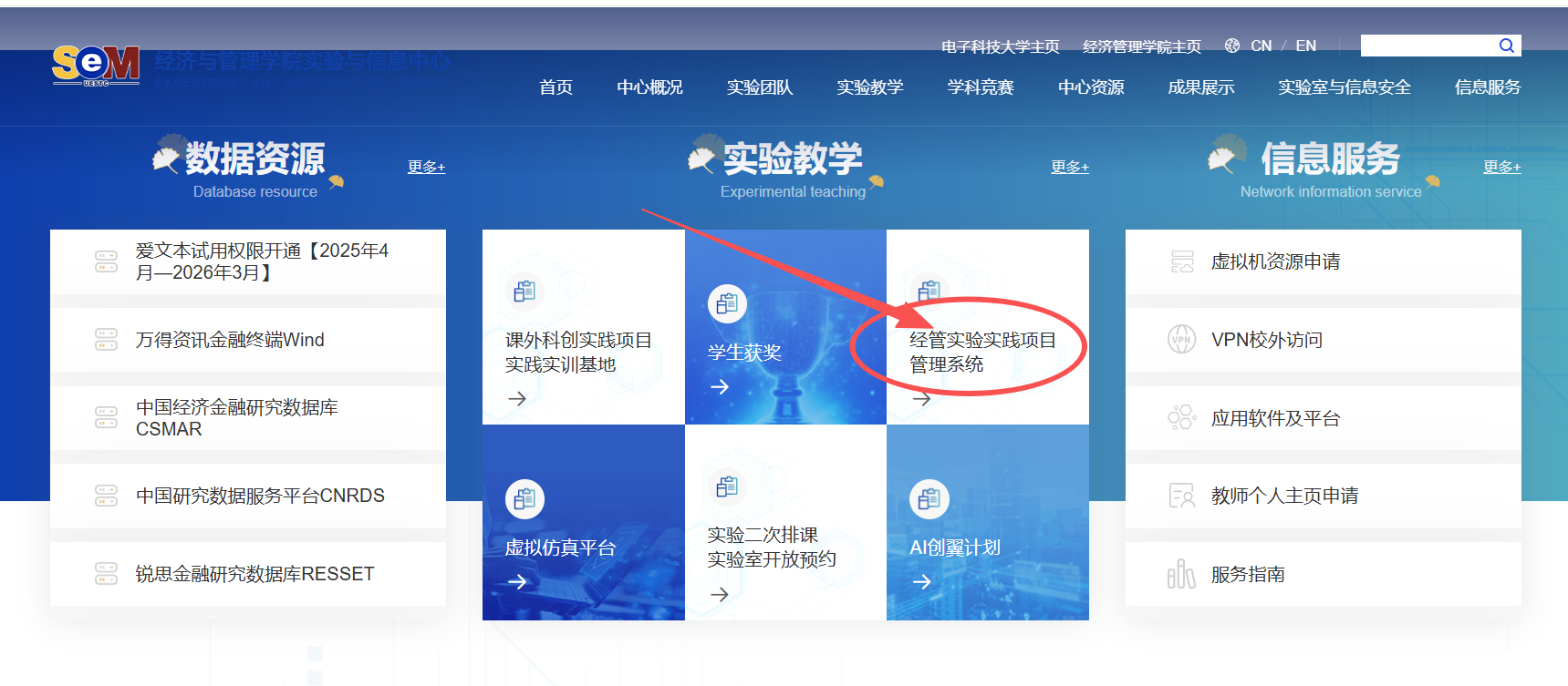 2、选择学校主页-经管学院主页-科学研究-实验中心,进入实验与信息中心主页,如下图所示: